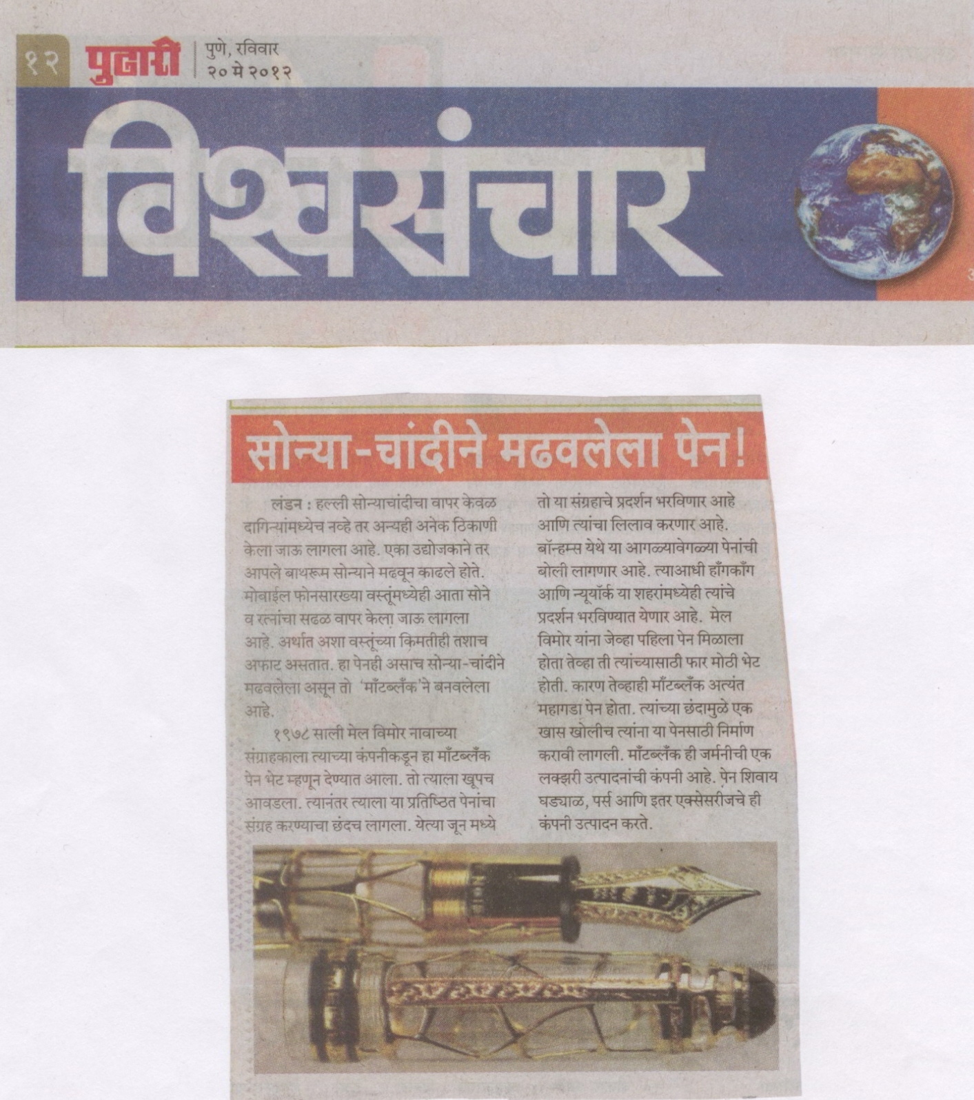 सोन्या – चांदीने मढवलेला पेन ! (दैनिक पुढारी , पुणे , २० मे २०१२ ) वाचा