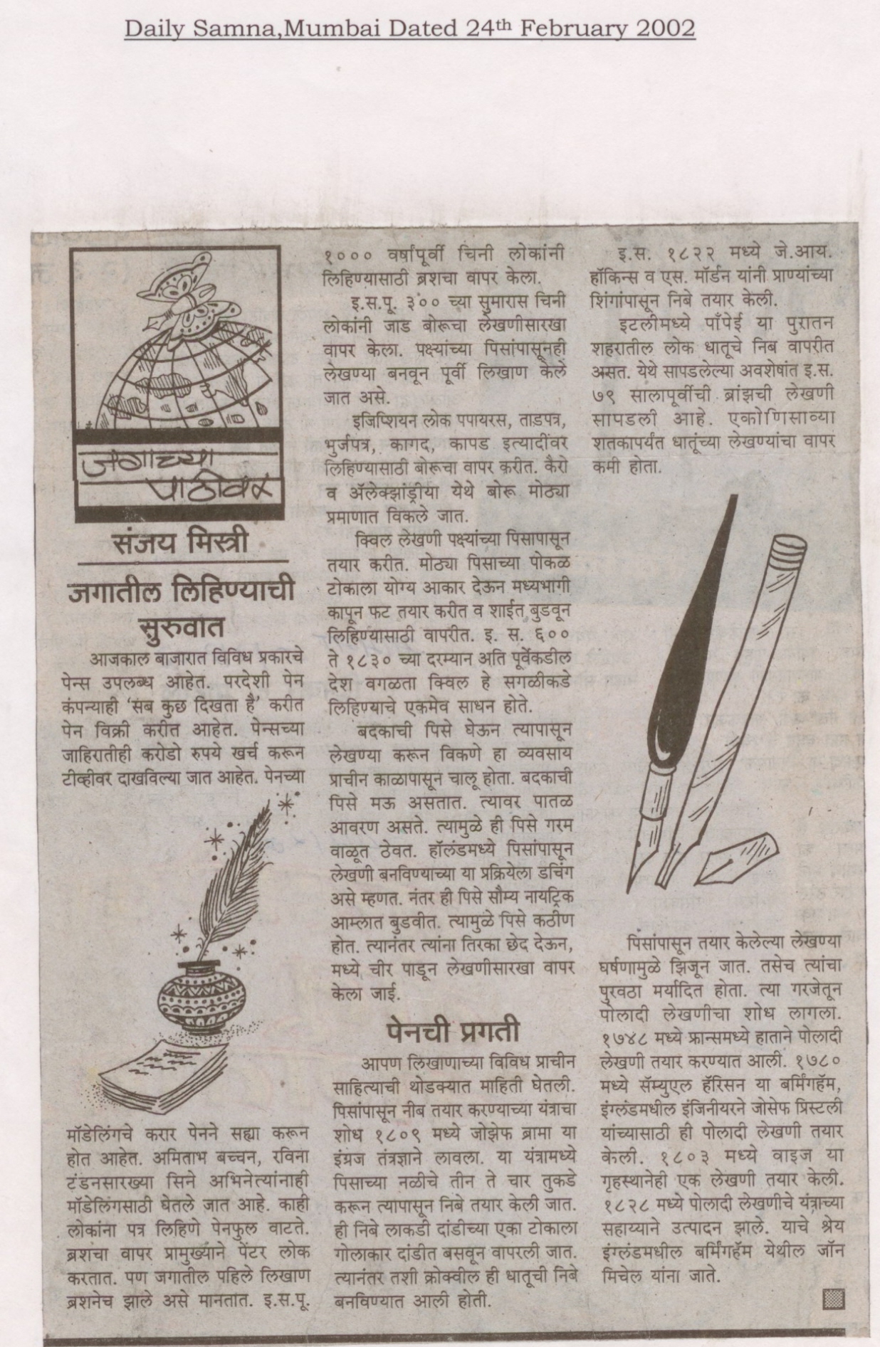 जगातील लिहिण्याची सुरुवात (दैनिक सामना, मुंबई , २४ फेब्रुवारी २००२) वाचा