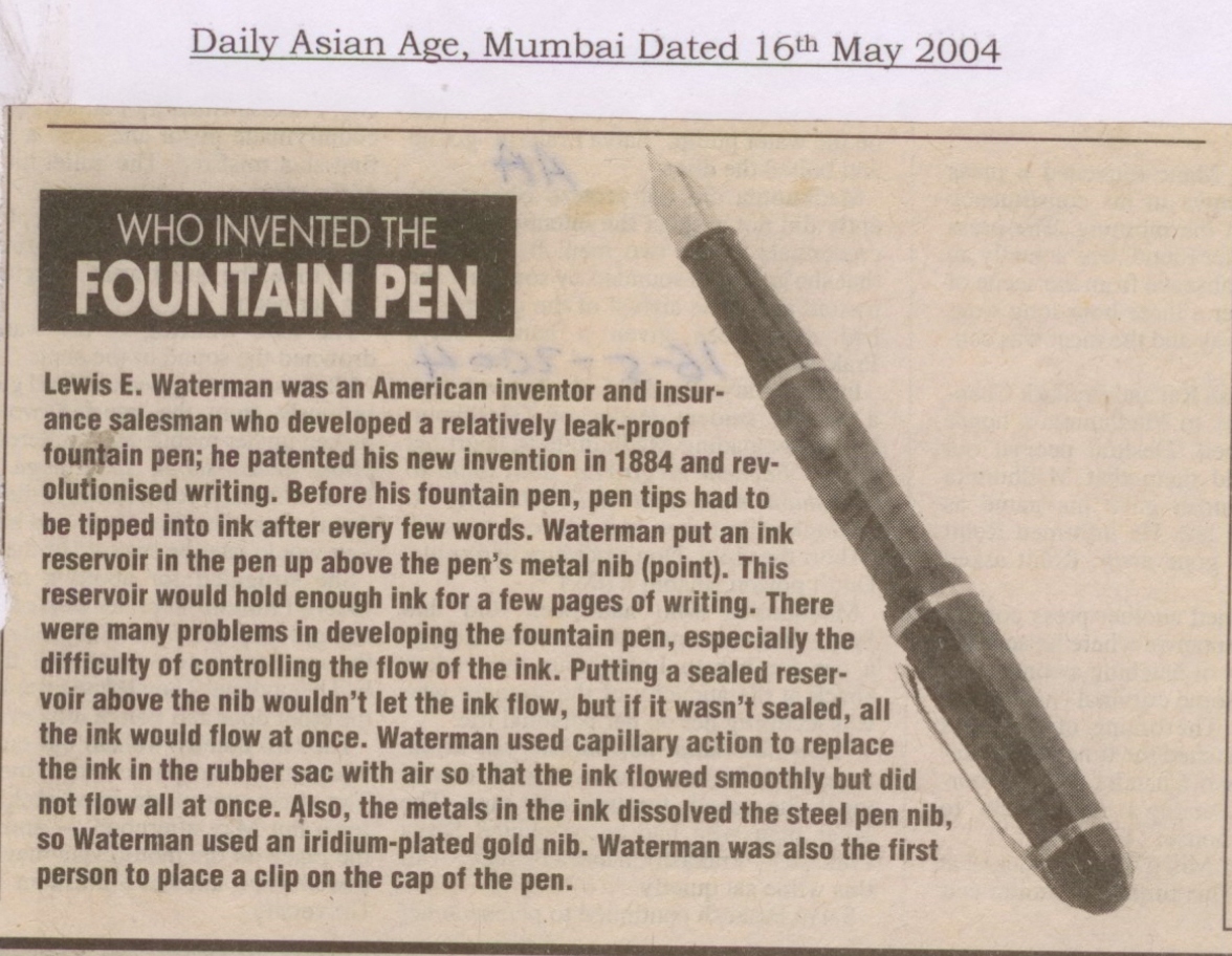 Who Invented the Fountain Pen.(Daily Asian Age, Mumbai, 16th May 2004) वाचा