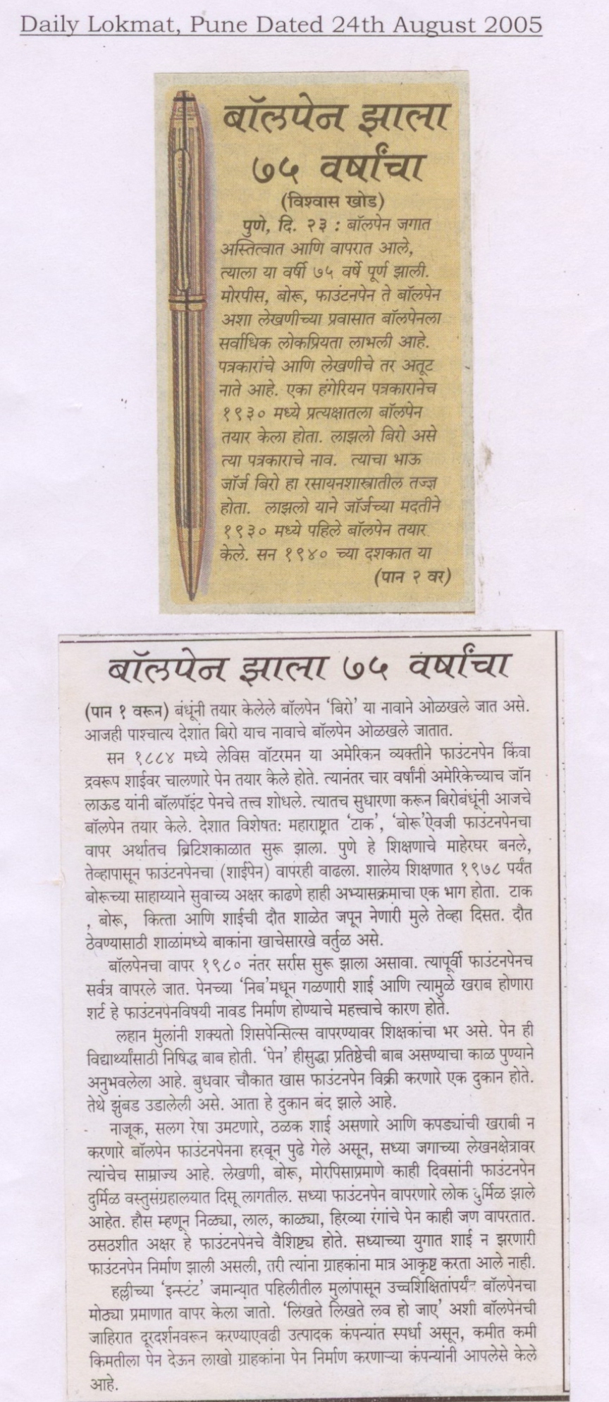 बॉलपेन झाला ७५ वर्षांचा (दैनिक लोकमत, पुणे, २४ ऑगस्ट २००५) वाचा
