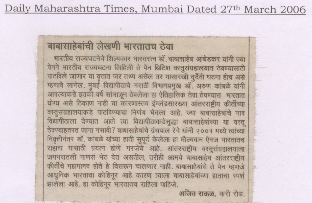 बाबासाहेबांची लेखणी भारतातच ठेवा (दैनिक महाराष्ट्र टाइम्स, मुंबई, २७ मार्च २००६) वाचा