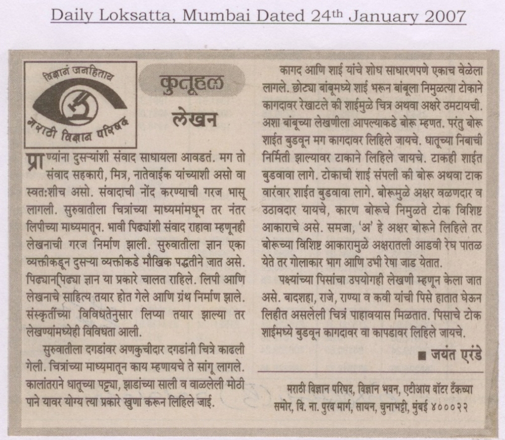 लेखन (दैनिक लोकसत्ता, मुंबई, २४ जानेवारी २००७) वाचा