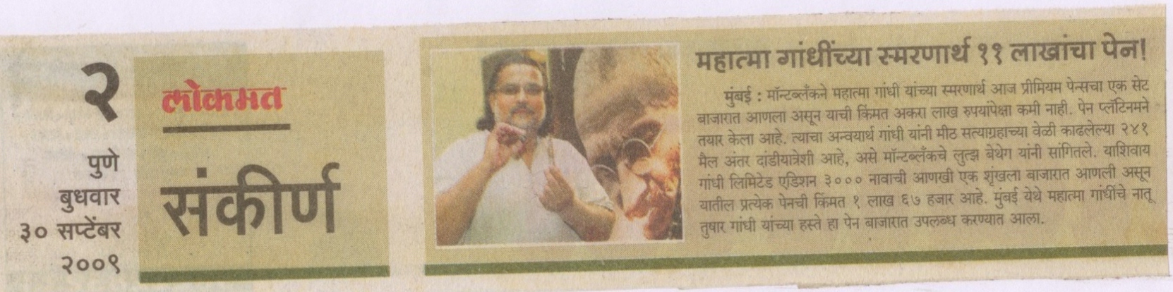 महात्मा गांधींच्या स्मरणार्थ ११ लाखांचा पेन ! (दैनिक लोकमत, पुणे, ३० स्प्टेंबर २००९) वाचा