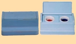 प्लॅस्टिकची आकाशी निळ्या रंगाची दौत. ८x६x३ से. मी. आकारमान, शाई ठेवण्यासाठी काढता घालता येण्यासारखी प्लॅस्टिकची दोन उभट शाईपात्रे, बिजागरी बसवलेले पेटीप्रमाणे झाकण, टाक ठेवण्यासाठी पुढयात खोबण.