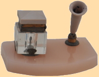 गुलाबी रंगाच्या अपारदर्शी काचेच्या बैठकीवर पितळेच्या चौकोनी क्लिप मध्ये पारदर्शी काचेची दौत. ११.५x१० से. मी. आकारमान, टाक ठेवणीसह ऊंची १० से. मी., दौतीस पितळेची कड व त्याला बिजागरीच्या साह्याने जोडलेले पितळी झाकण, झाकणावर प्लॅस्टिकचा शंकू.